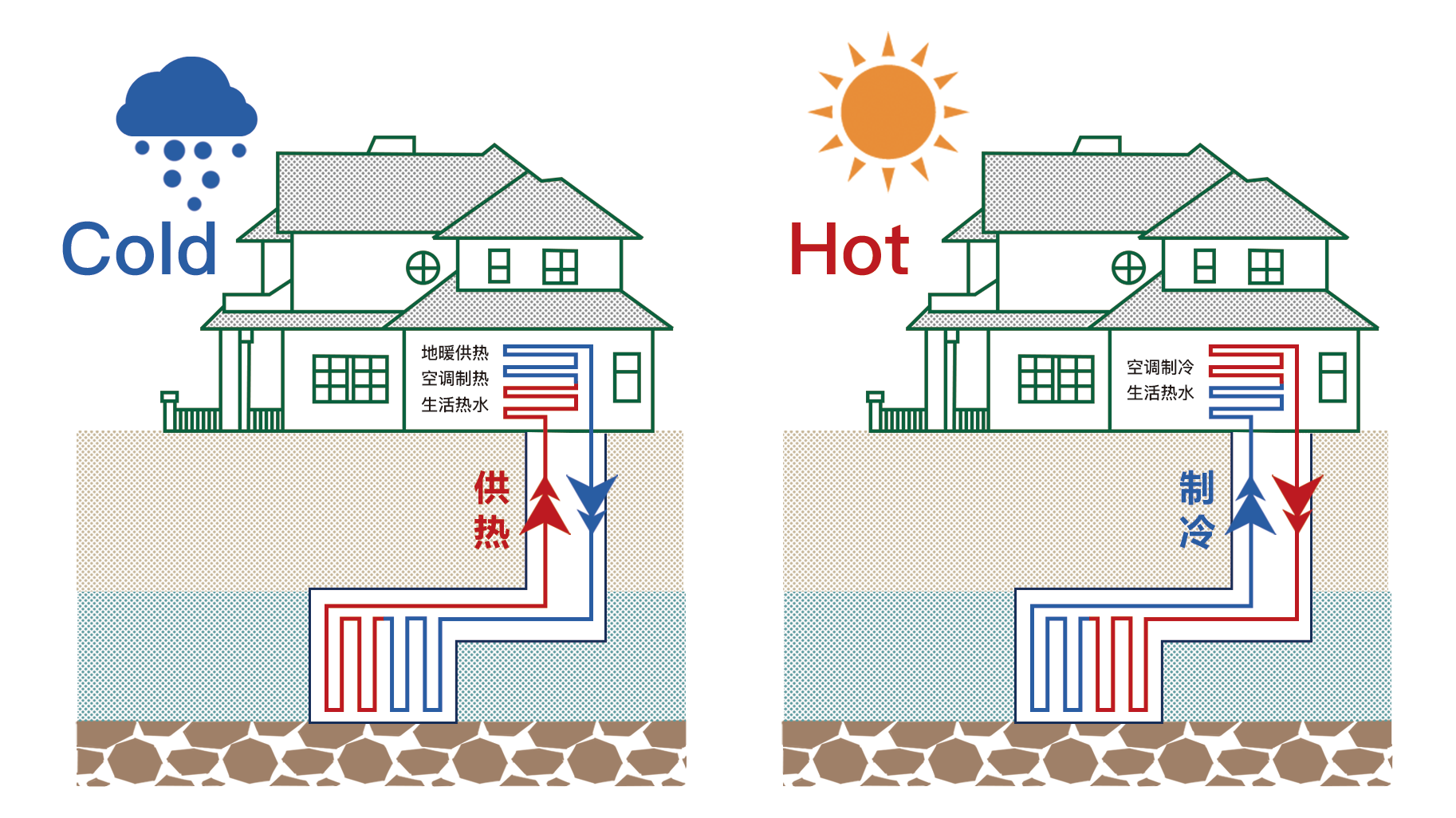 地源热泵最早于1912年瑞士专利文献中提出,是利用浅层地能进行供热制冷的新型能源利用技术,通过利用地下土壤巨大的蓄热蓄冷能力,冬季地源把热量从地下土壤中转移到建筑物内,夏季再把地下的冷转移到建筑物内,一个年度形成一个冷热循环。
